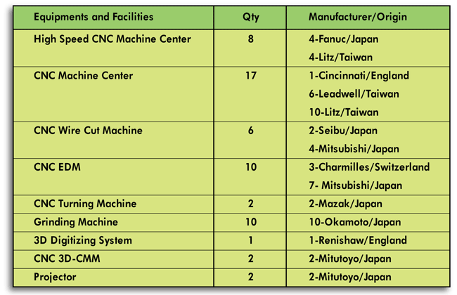 Other facilities such as milling, drilling, lathe, sawing, EDM drilling machines are not listed on this table